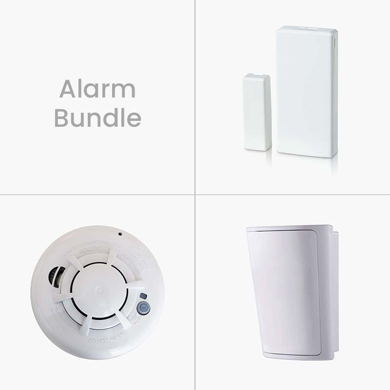 This bundle includes 1 alarm panel, 5 door sensors, 2 motion detectors, and 1 smoke detector.